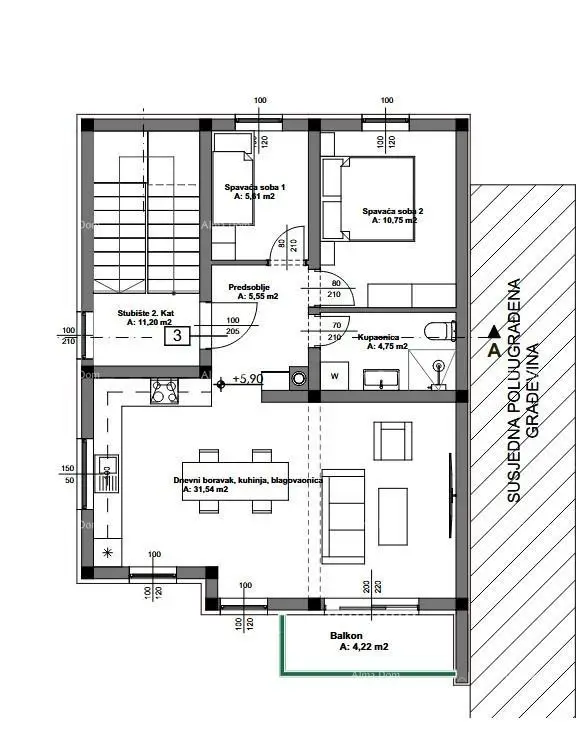 Zum Verkauf steht eine Wohnung im Bau im 2. Stock eines Gebäudes mit insgesamt 3 Wohnungen, wobei ausschließlich die genannte Wohnung verkauft wird. Sie befindet sich in einer ruhigen ländlichen Umgebung, 10 Fahrminuten vom Stadttrubel von Pula entfernt.