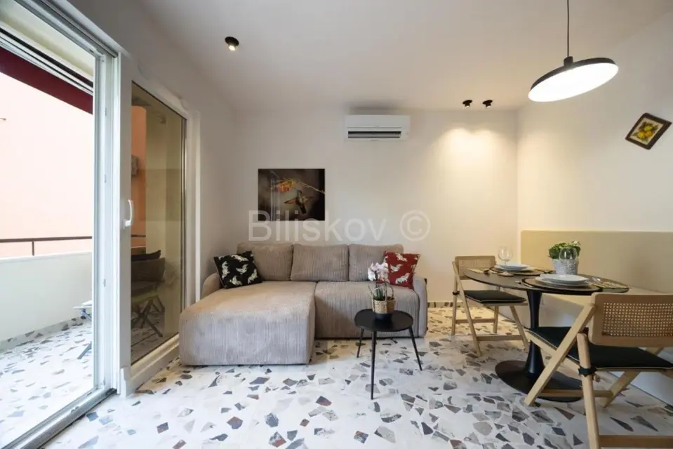 Sastoji se od kuhinje s trpezarijom i dnevnog boravka, spavaće sobe, kupaonice i terase. Stan je klimatiziran, renoviran i kompletno novoopremljen.